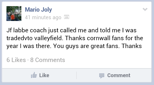 Although no official statement has come from the team yet, it was Joly himself who announced his being traded on the Cornwall River Kings facebook fan page.