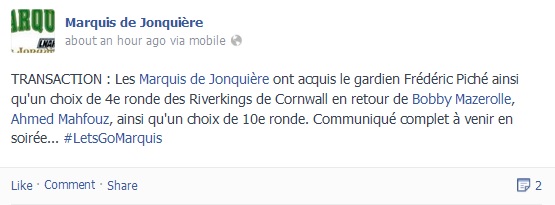 Translated, this status says that Frederic Piche and a 4th round pick are being sent to Jonquiere in exchange for Bobby Mazerolle, Ahmed Mahfouz and a 10th round pick.