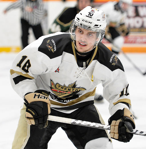 Out of St. Catherine’s, Ontario, comes over-ager Kevin Lavoie. The 5’10 centreman had a remarkable season for Trenton shining in the both the regular and playoffs. A hardworking two-way forward, Lavoie was offered a full ride scholarship to Robert Morris University near Pittsburgh. After this season he’ll join former Carleton Place Canadiens captain, Elie Ghantous with a spot on the Colonels. The brass from his former GOJHL team, the Thorold Blackhawks had nothing but the best compliments to give him.