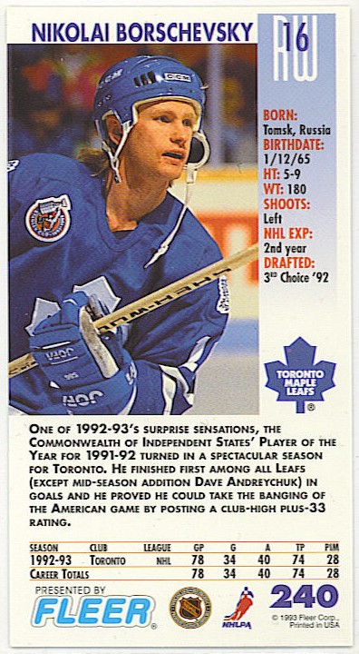 The Leafs gambled and picked him up in the 1992 NHL Entry Draft and it managed to pay off. Borschevsky exploded for almost a point a game in his rookie year and ended up second in team scoring; second only to Gilmour. Another crucial piece to that 1993 team that keep haunting the Leafs until the current group manage to reach the second round of the playoffs.